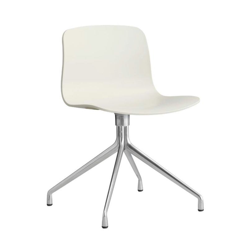 About A Chair AAC 10 har en vridbar aluminiumbotten, vilket ger den ett mer formellt utseende än modellerna med träben. Stolen behåller det öppna, böjda skalet och de utåtvända benen, men har en bas i polerad eller pulverlackerad aluminium. Skalet, tillverkat av återvunnen plast, finns i flera moderna färger och med olika klädselalternativ. Det breda utbudet av varianter gör stolen mångsidig och lämplig för både kommersiella, privata och offentliga utrymmen.