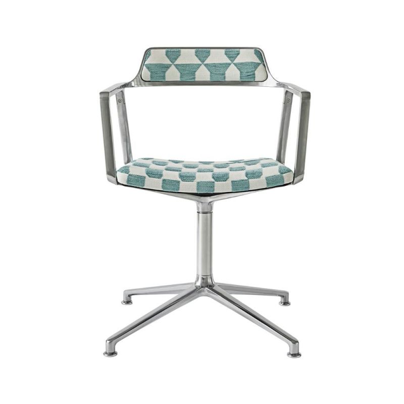 Denna specialutgåva av Vipp snurrstol är klädd i ett slående, tvåfärgat mönstrat tyg inspirerat av ett medeltida vapen. Stolen, skapad för Vipp Townhouse i Lagrasse, kombinerar klassisk mönsterkonst med modern komfort. Det historiska motivet designades ursprungligen av det berömda franska textilhuset Maison Le Manach och har omtolkats av Pierre Freys verkstäder i norra Frankrike.