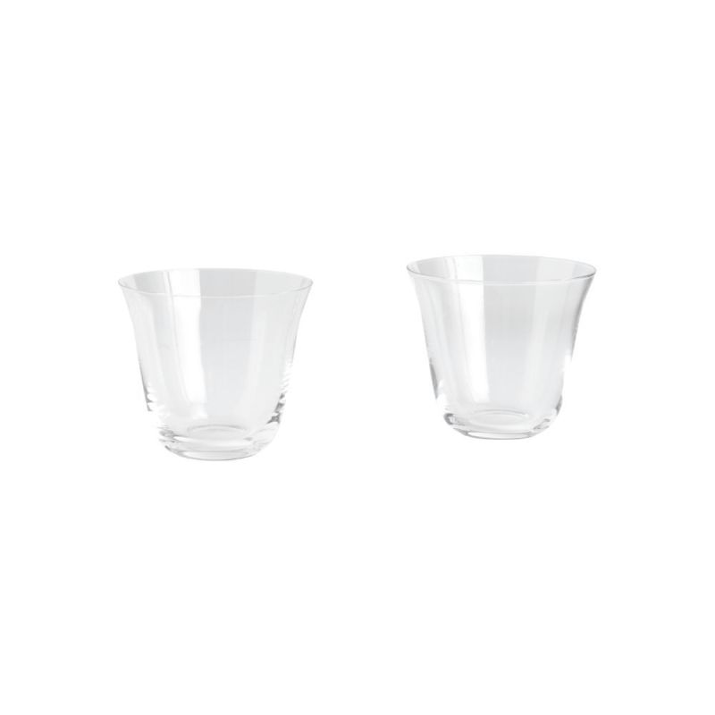 Curve Tumbler-glasset med 2 st. Curve Tumbler-glas har en distinkt form med en lätt utåtböjd kant som kombinerar enkelhet och elegans. De munblåsta glasen är tillverkade av fint glas med 20 % återvunnet material och har en generös storlek, perfekt för vatten, vin och andra drycker. Levereras som ett set om två och kan matchas med andra glas eller bågar från HAY för en elegant look på bordet.