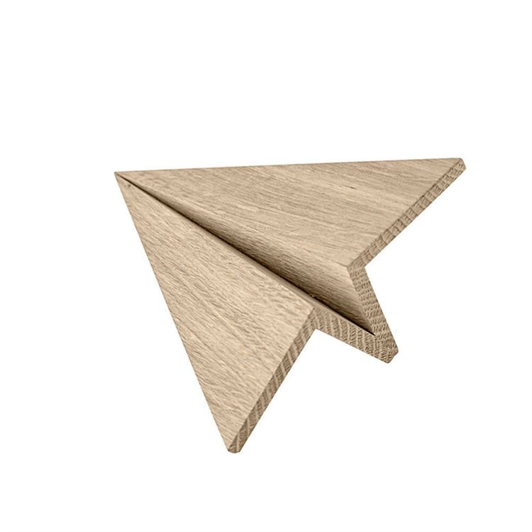 Maverick, pappersflygplanet i trä. Ett nostalgiskt minne från barndomens pappersflygplan, här tolkad i massiv ek. Lätt och luftig design, redo för avfärd – och med nylontråd kan Maverick till och med “flyga” på riktigt.