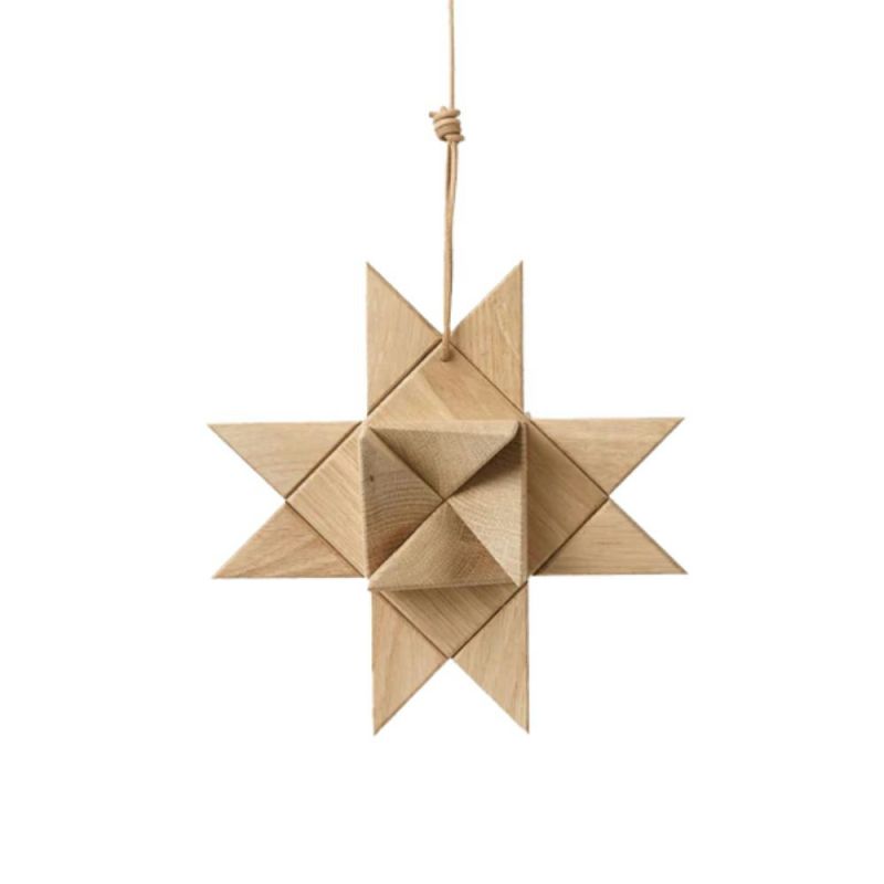 Fröbelstjärnan, en klassisk jultradition återskapad i massiv ek med mjuka kanter och lädersnöre för upphängning. Inspirerad av de flätade pappersstjärnorna, som väcker minnen från barndomens jul. Vacker ensam eller i en grupp.