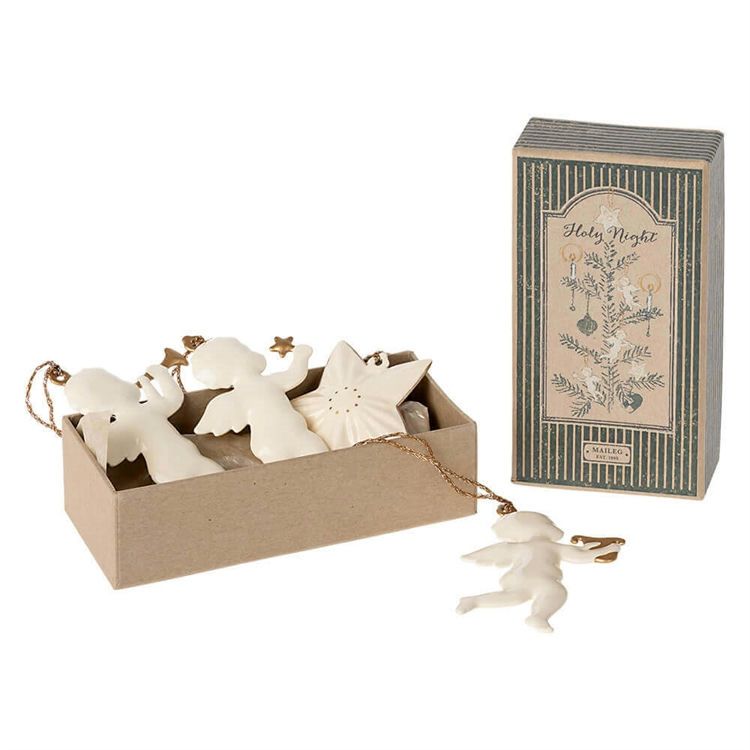 Denna presentförpackning med 4 vackra Maileg ornament är perfekt för alla tillfällen. Den innehåller 3 olika änglar och en stjärna, alla inslagna i silkespapper och levererade i en presentask dekorerad med Dorthe Mailils teckningar.