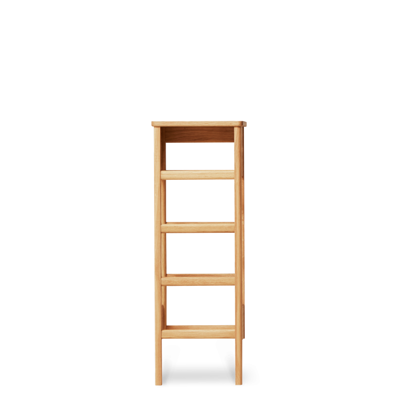 A Line skoställ är en praktisk och snygg förvaringslösning som kombinerar skohyllor och ett konsolbord för att utnyttja utrymmet i hallen, grovköket eller entrén. Möblerna är tillverkade av hållbar ek med rundade linjer och fokus på hantverkstraditioner. Den översta hylla fungerar som ett konsolbord och varje hylla rymmer ett par skor, totalt fyra par. Möbeln kan fästas på väggen med de medföljande fästena eller stå fritt mot väggen.