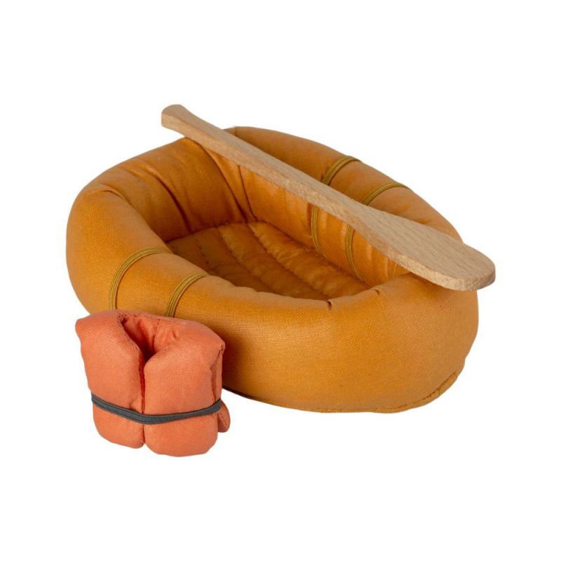 Denna lilla uppblåsbara båt är gjord av tyg och kommer med flytväst och paddel. Den är inte vattentät, så du måste föreställa dig att den flyter på vatten. Kombinera den med vandrande möss och andra utomhustillbehör för att utöka historien.