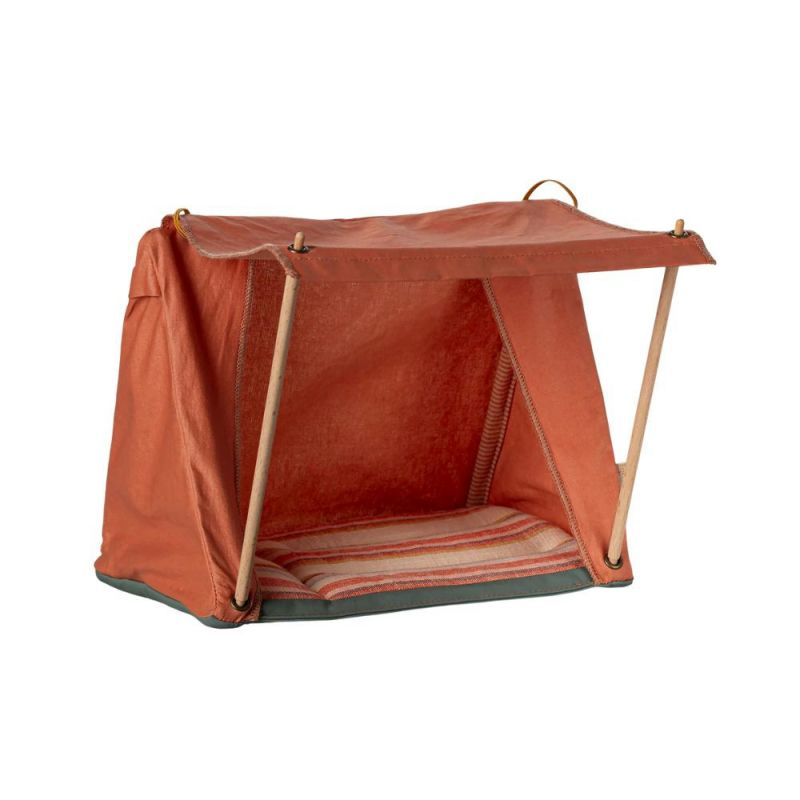 Ta med musen för en natts sömn i det hopfällbara tältet. Träpinnar kan hålla tältdörren öppen och ge skydd mot regnet. Yttertyget har en beläggning på ytan för en mer autentisk look. Glöm inte att mössen måste ha med sig sina sovsäckar.
