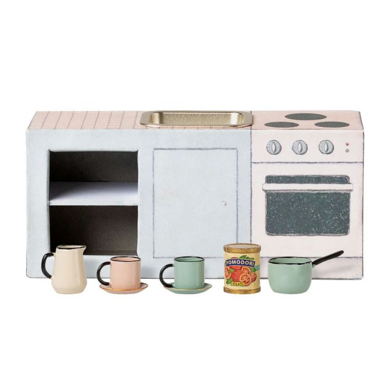 Det lille køkkenbord leveres med 2 kopper, 2 tallerkener, en gryde, en kande og en dåse. Vasken er i metal for et realistisk udtryk. Passer perfekt til køkkenet i Suitcase-musehuset.