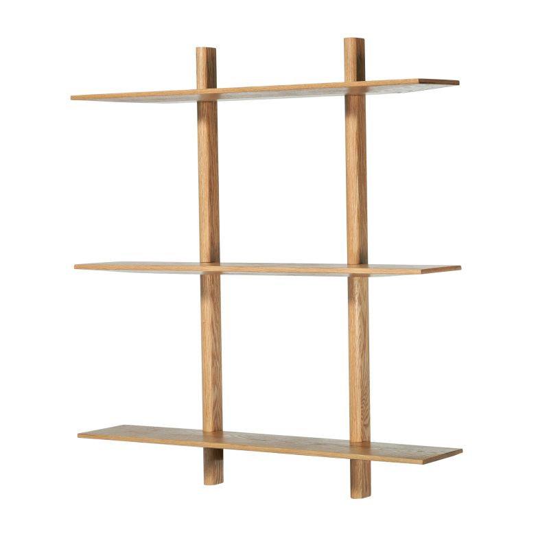 Muubs Noir Shelf. Elegant hyldesystem i egetræ med 3 hylder og underfræste kanter, der giver et eksklusivt, håndværkspræget udtryk. Ideel til både køkken, stue eller kontor brug den til service, dekorationer eller bøger. Hver hylde kan bære op til 5 kg. Et stilrent og funktionelt væghængt reolsystem til hele hjemmet.