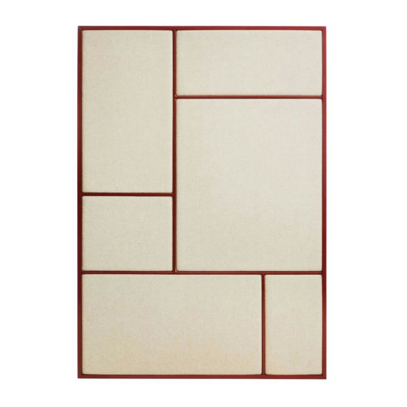 NOUVEAU PIN Opslagstavle Large, Basque Red. NOUVEAU PIN er en stilren og alsidig opslagstavle, ideel til alt fra fotos og koncertbilletter til moodboards og noter. Designet er inspireret af moderne arkitektur og Art Nouveau-stilen, med et rektangulært gittermønster og en præcis kantprofil. Tavlen fås i tre størrelser, alle med en fælles målestok på én side, hvilket gør det let at kombinere flere tavler i et personligt mønster perfekt til både hjemmet og kontoret. Den har en diskret gribekant hele vejen rundt og leveres med skjulte monteringsbeslag. Tavlen har desuden en lydabsorberende effekt, som bidrager til en rolig atmosfære.