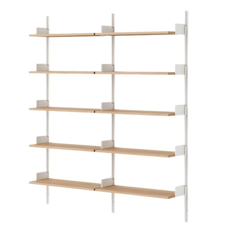 New Works hyllsystem är en enkel och flexibel vägghylla med ett tidlöst, nedtonat uttryck. Designen är genomtänkt in i minsta detalj från de kantiga väggskenorna till de integrerade bokstöden och platta fingerskruvar i rostfritt stål.