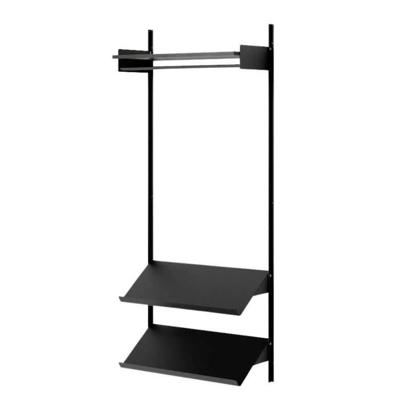 Med nya element för förvaring av kläder tar sig New Works hyllsystem in i hallen och garderoben och tillför ett raffinerat uttryck till en annars praktisk möbel. New Works Wardrobe Shelf 1 levereras med en kombinerad hatthylla och klädstång samt två skohyllor för optimal förvaring.
