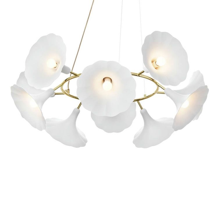 10 blomsterformede skærme af hvidt metal svæver elegant fra en poleret messingring, der skaber et romantisk udtryk.