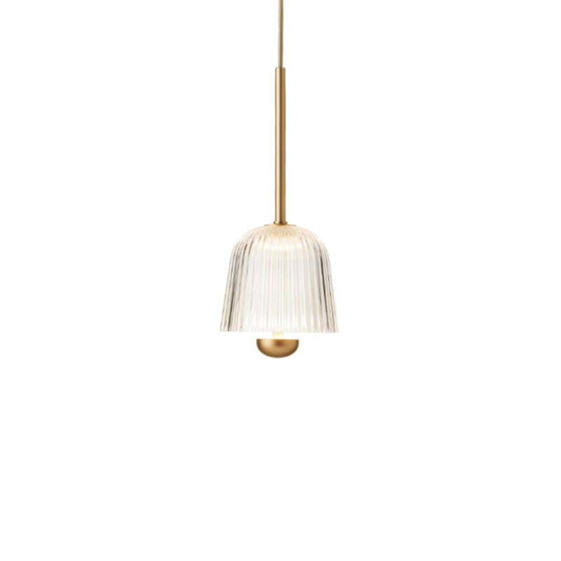 Asteea 1 Hänge. Asteea 1 kombinerar modern enkelhet med ett organiskt uttryck. Den klockformade skärmen i satinmässing och räfflad akryl sprider ett mjukt, bländfritt ljus från den integrerade LED-lampan. Använd den ensam eller i rad ovanför matbord eller en köksö och ge rummet värme och karaktär.