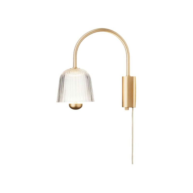 Asteea-väggen. Asteea Wall överför kollektionens mjuka blommiga silhuett till väggen. Den roterbara och dimbara lampan i satinmässing har en räfflad akrylskärm och integrerad LED som sprider ett mjukt, atmosfäriskt ljus. En varm och elegant lösning för sovrummet, hallen eller läshörnan.