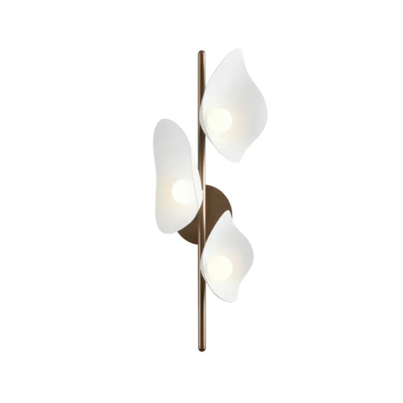 Florii 3-vägg. Florii 3 Wall är en elegant, avlång vägglampa med en mörk bronsfärgad metallstång och tre vita metallskärmar som avger ett varmt och inbjudande ljus. Den skulpturala designen gör den idealisk vid spegeln i hallen eller badrummet. Lampan har integrerad och lätt utbytbar LED-teknik, vilket säkerställer effektiv och hållbar belysning.