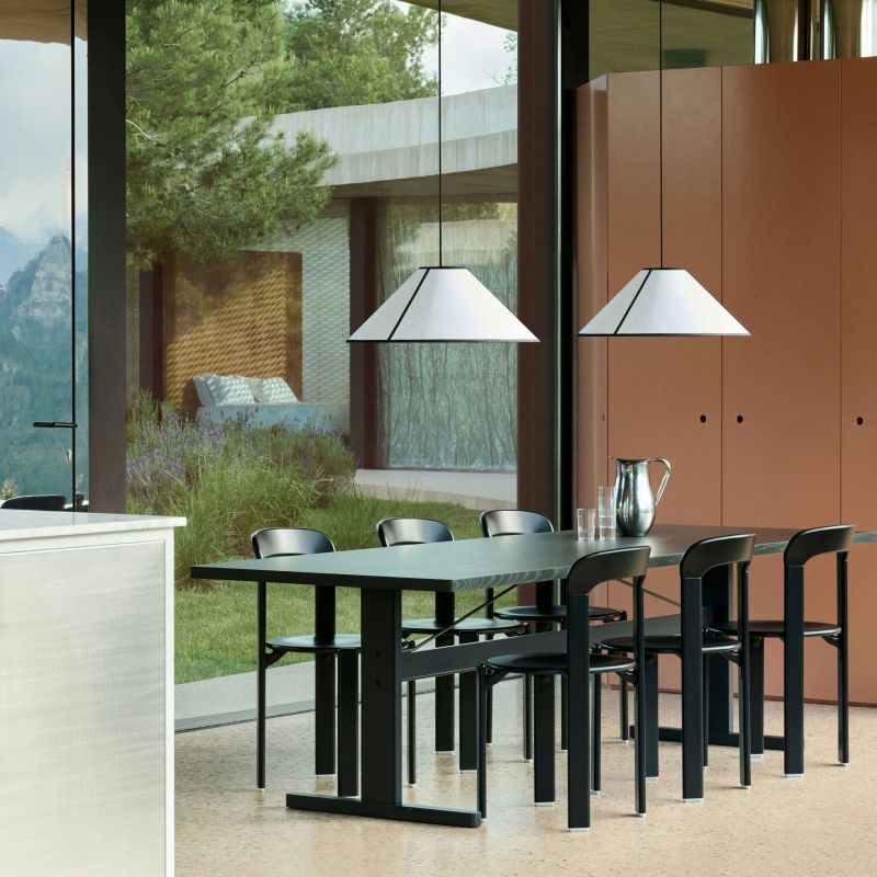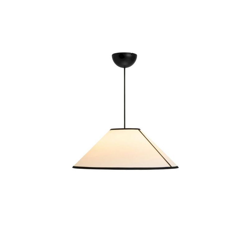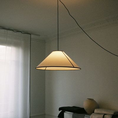 Ava Cone Taklampa designad av Ana Kra för HAY. Modern tolkning av den klassiska empire-pendeln med konformad, semi-transparent skärm i ECOPET (återvunnen PET-plast) och kontrastfull kant i tyg. Lampan ger mjukt, stämningsfullt ljus och passar perfekt i sovrum, hallar, vardagsrum och matsalar. Levereras med HAY Common Cord Set och använder utbytbar, dimbar LED-lampa.