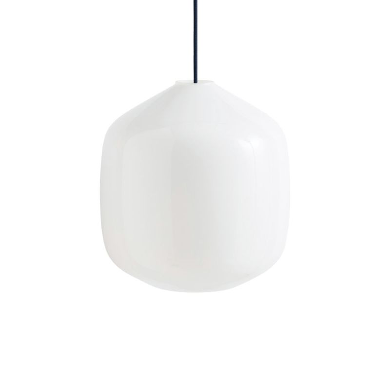 Bordslampan Buoy Glass från HAY, designad av Aspekt Office, kombinerar enkelhet och funktion. Med en skärm i opalglas och svart sladd ger lampan stämningsfull belysning till sovrum, hallar, över köksöar eller matbord och skapar värme och atmosfär i alla rum. Lätt att installera och underhålla utan verktyg. Finns i två storlekar med olika färgade trådar.