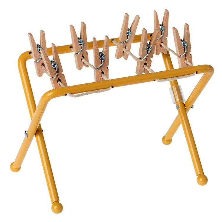 Når musefamilien skal hænge vasketøjet op, er dette tørrestativ det perfekte valg. Det er lavet til deres tøj og leveres med små træklemmer, der holder tøjet på plads.