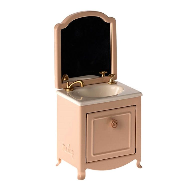 Et must-have til badeværelset for musene. Kommoden har både et lille skab under vasken og et spejl. For at fuldende badeværelset, tilføj Maileg-toilettet og badekaret.