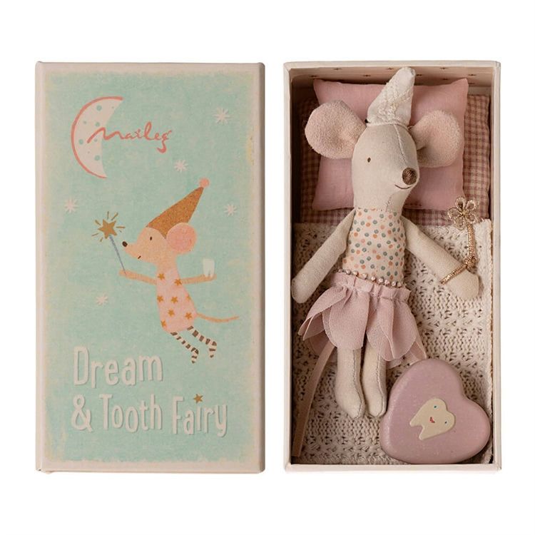 Möt Maileg-tandfen, som för med sig äventyr och drömmar! Hon samlar mjölktänder och säkerställer söta drömmar, klädd i sina magiska kläder och sover tryggt i mjuka sängkläder. Setet innehåller även en tandpetare och tändsticksask perfekt för läggdags.