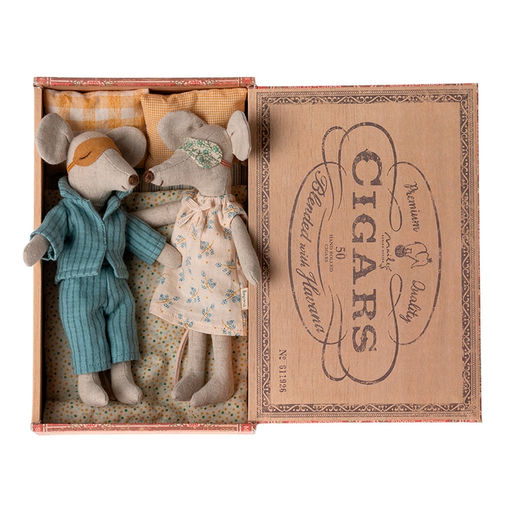 Mamma och Pappa mus från Maileg är redo för natten i sina fina nattkläder och sovmasker. Cigarrlådan är en mysig säng som säkerställer söta drömmar. Med varierande sängkläder blir varje set unikt och charmigt.