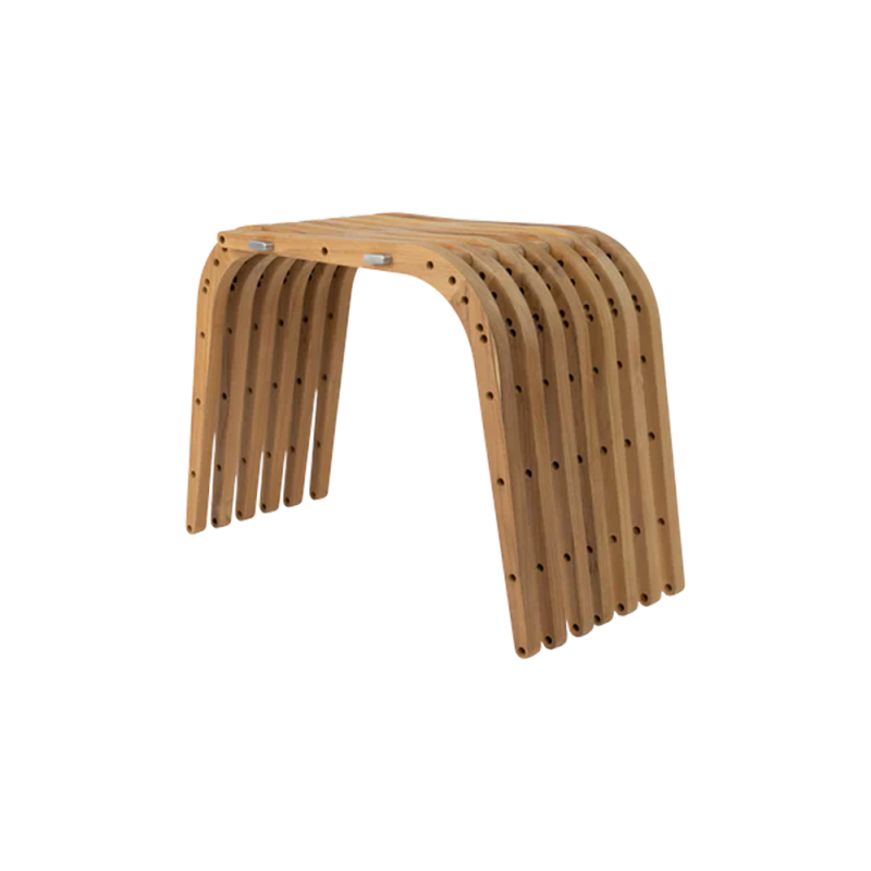 Multifunktionell stol, pall och bord tillverkad av 13 boomeranger i FSC-teakträ för både inomhus- och utomhusbruk.