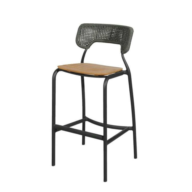 Mindo 102 Barstol är både hållbar och elegant, designad med komfort i fokus. Den har en robust aluminiumstomme, en sits av lätt böjda teaklameller och ett karaktäristiskt ryggstöd i flätat rep, vilket gör den idealisk för restauranger, hotell eller hemmabarer.
