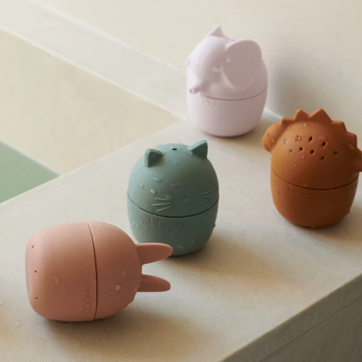 Gör badet till en rolig och mysig stund med Gaby badleksaker. Den mjuka silikonen gör dem lätta att hålla för små händer och de färgglada och fina djurformerna gör dem till favoriter under badet. Leksakerna kan både flyta och användas som små vattenkannor.