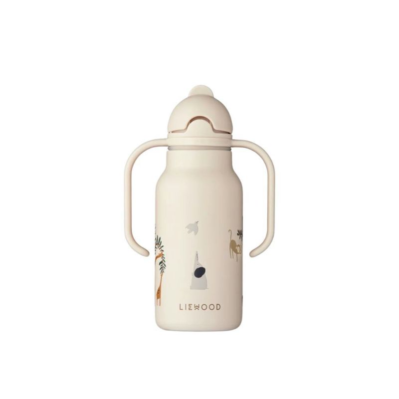 Den innovative, småbarnsvänliga vattenflaskan, KIMMIE, har två praktiska handtag på locket, ett inbyggt sugrör och är gjord av rostfritt stål. Den är designad för att vara lätt för små händer att hantera när de lär sig dricka själva.
