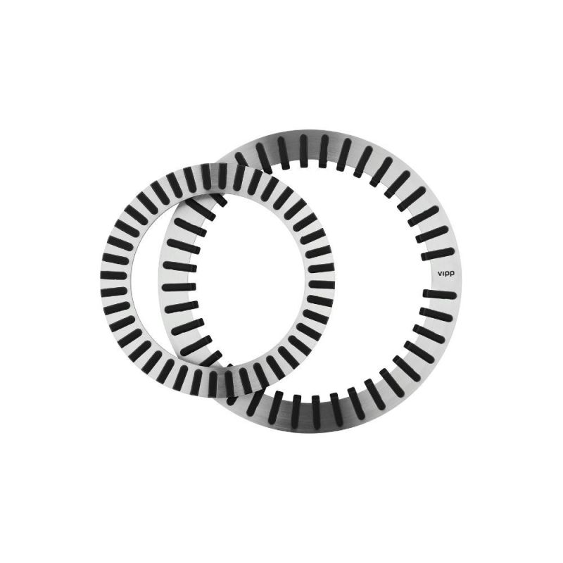Vipp grytlappssetet består av en liten och en stor grytlapp, som kan sättas ihop. De laserskurna stålytorna är försedda med värmebeständigt silikongummi som skyddar både bordet och krukorna. Setet tål maskindisk och kombinerar funktionalitet med ett elegant utseende.