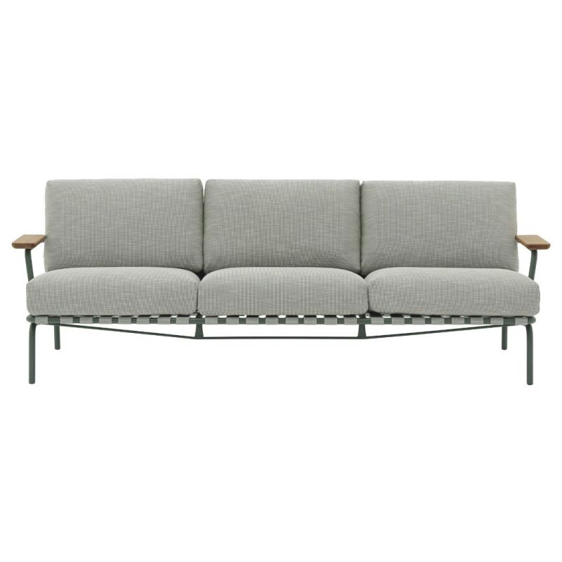 Settle Outdoor Sofa kombinerer komfort og stil til udendørs brug. Den luftige stålramme med fine detaljer og FSC-certificerede (FSC-C028824) sapele-mahogni armlæn giver en varm og indbydende følelse. Stellet er galvaniseret, grundet og pulverlakeret for lang holdbarhed, mens de hurtigtørrende hynder i slidstærkt stof sikrer komfort året rundt.