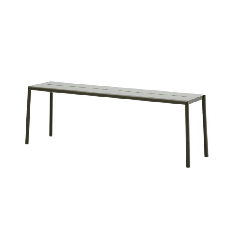 Maj-serien. Utemöbler i pulverlackerat stål skapade för trädgård, terrass och balkong. Serien består av stapelbara stolar med och utan armstöd samt bord i två storlekar, alla designade för att komplettera varandra. Den monokroma looken är enkel och elegant, medan den böjda stålplåten och robusta ramen säkerställer både styrka och komfort. En diskret slits i sitsen ger dränering och lätthet, ett designdrag som går igen i hela serien och binder samman uttrycket.