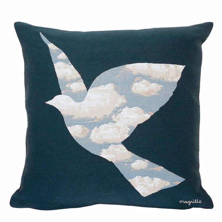 Kunstner Rene Magritte er kendt for sine anderledes, men smukke malerier. Han malede almindelige ting på sine billeder, men alligevel gjorde han dem så gådefulde, at det gav beundrernde af hans kunstværker noget at tænke over. Rene Magritte malede dette maleri L´oiseau de ciel i 1965. Det originale maleri forestiller en due, der med kroppen fuld af skyer flyver over en oplyst landingsbane. Poulin Design og det franske væveri Jules Pansu producere disse smukke puder med nogle af Magritte kunstværker på. Pudebetrækket på Poulin Design puderne er af 100% duntæt bomuld og fremstillet uden kemikalier.