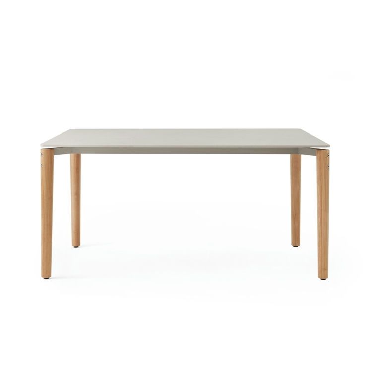 Vipp Open-Air matbord finns i två storlekar och består av en aluminiumram med en 12 mm keramisk bordsskiva. Benen är koniska och gjorda av teak. Små justerbara fötter är placerade under varje ben, vilket gör det möjligt att justera bordets höjd beroende på underlaget.