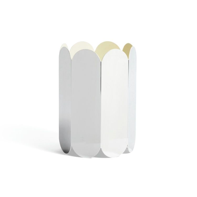 Arcs Vasen er designet af den belgiske duo Muller Van Severen og er formet af en sammenhængende kæde af lodrette buer, der skaber en elegant, bølget silhuet. Vasen er lavet i rustfrit stål med spejlfinish eller stål i forskellige farver og fås i to størrelser.