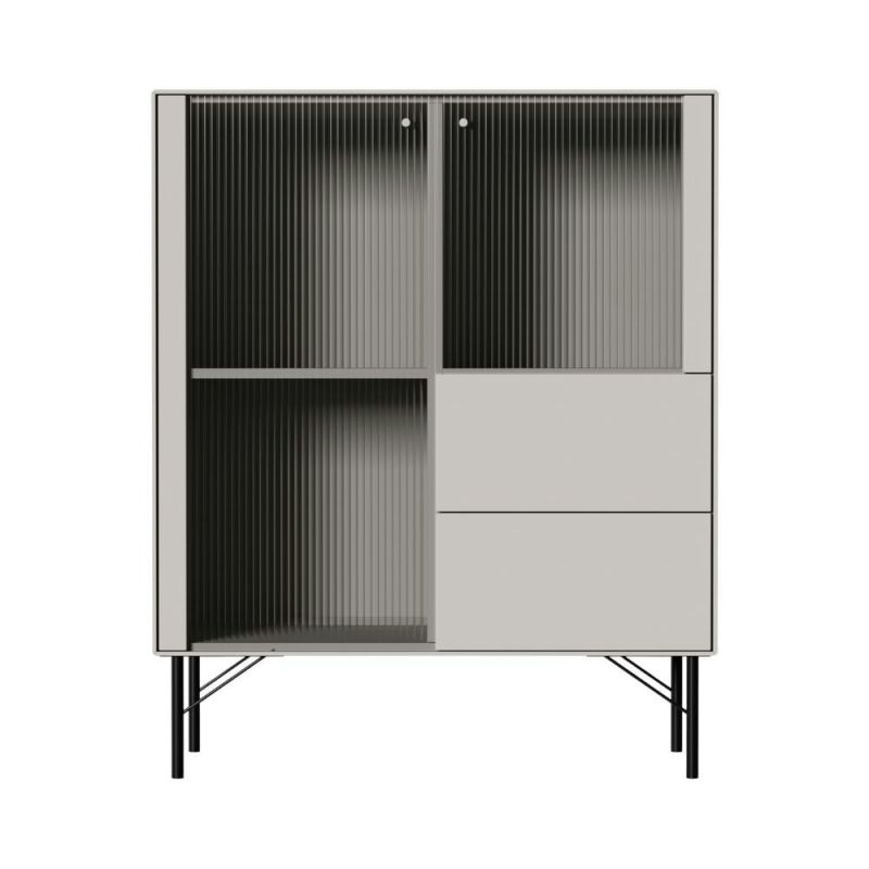 Kantskåp med vitrindörrar och lådor i räfflat glas. Snyggt skåp med ben från Edge by Hammel, designat av Says Who. Färdig i den nya färgen glimmergrå med två lådor och två dörrar i elegant räfflat glas. Perfekt för förvaring i matsalen, vardagsrummet eller hallen. Mixa och matcha med resten av Edge-serien för att skapa din personliga lösning. Edge by Hammel kombinerar nordisk minimalism och handtagsfri design med gediget, danskt hantverk producerat med fokus på kvalitet och hållbarhet i Hammel.