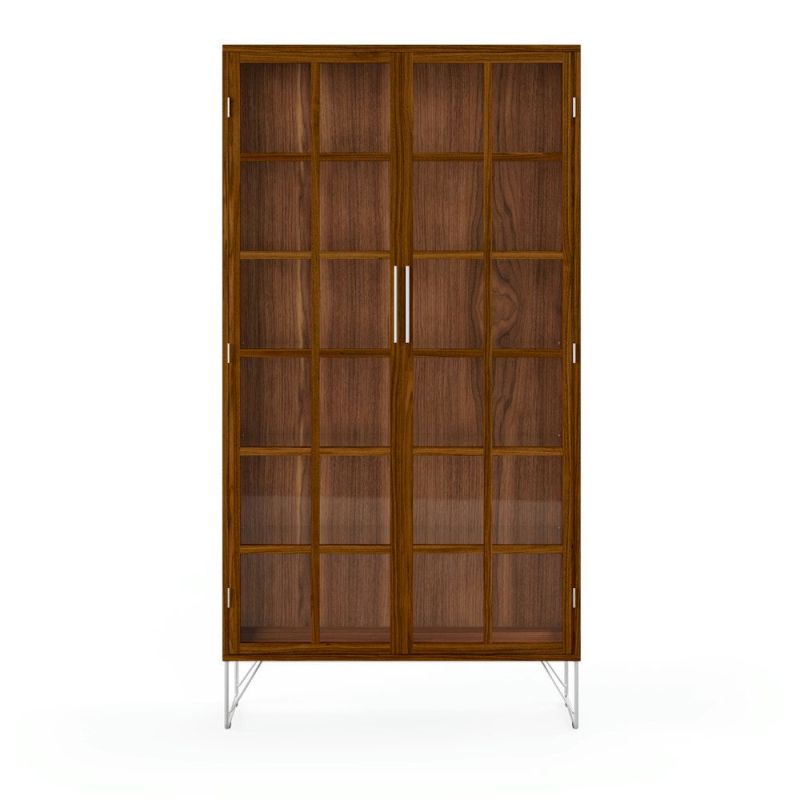 Det fint bearbetade massiva träet med de dekorativa benen av borstat stål och det klara glaset på sidorna och fronten, ger vitrinen ett lätt och elegant uttryck