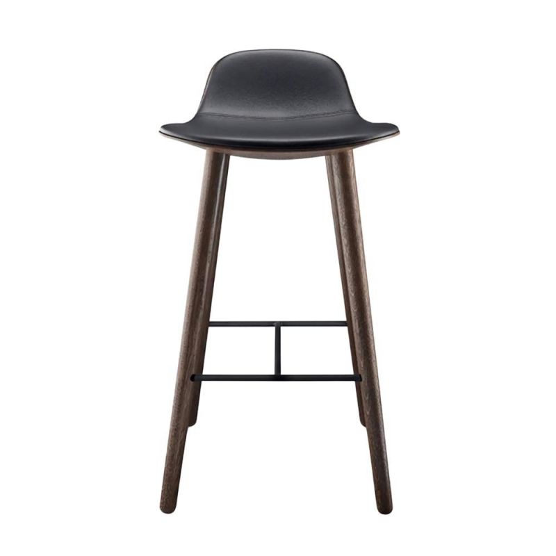 Yuuga Barstool. Yuuga barstolen er designet med udgangspunkt i, at barstole ofte betragtes bagfra. Derfor kombinerer Yuuga et ydre i formpresset 3D egetræsfiner med en blød inderside i støbt skum og læderpolstring en kontrast, der giver både visuel elegance og høj siddekomfort. Den organiske form og kompakte størrelse gør stolen ideel til at skabe luft og bevægelsesfrihed omkring bordet, samtidig med at man sidder behageligt i længere tid.