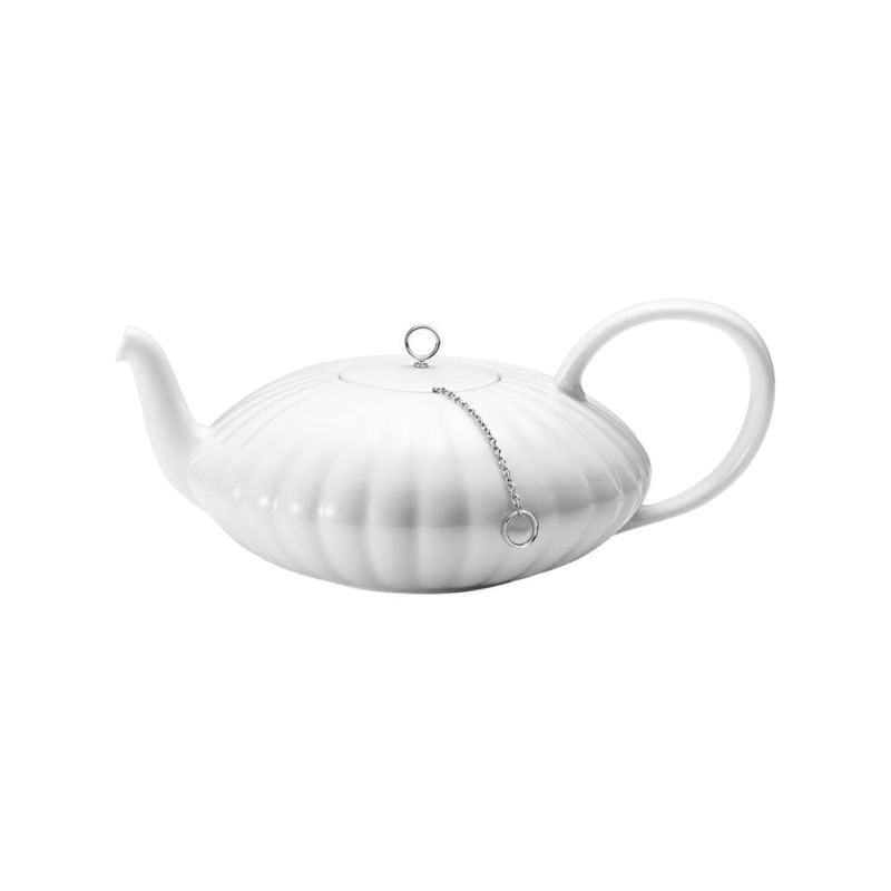 Denna eleganta tekanna i porslin kombinerar Sigvard Bernadottes klassiska designstil med inspiration från japanska teceremonier. Tekannan har ett distinkt handtag och levereras med en sil i rostfritt stål, fäst med en kedja som förblir kall under bryggningen, perfekt för enkel och elegant tebryggning.