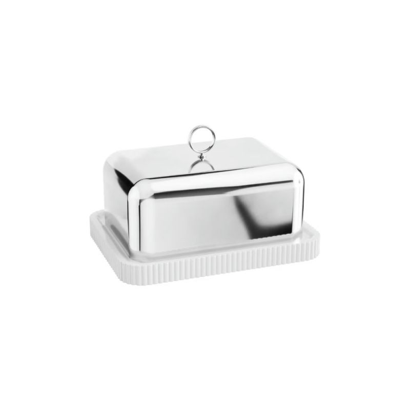 Denna eleganta smörskål i rostfritt stål och porslin är en modern tolkning av ett klassiskt köksredskap. Den är en del av den ikoniska Bernadotte-kollektionen, designad av svenske Sigvard Bernadotte i samarbete med Georg Jensen sedan 1930-talet, och kombinerar funktionalitet med förfinad estetik. Porslinsinsatsen tål maskindisk, medan handdisk rekommenderas för att stållocket ska behålla sin blanka yta. Passar europeiska 250g smörblock.