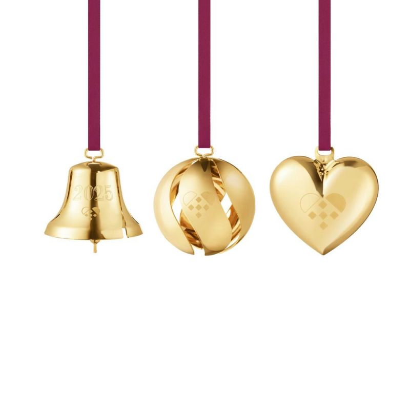 Detta set med tre förgyllda julgranskulor från Georg Jensens julkollektion 2025 innehåller en julklocka, en julkula och ett julhjärta, alla med eleganta gravyrer av det ikoniska flätade julhjärtat. Med sina glittrande ytor och fina detaljer ger julgranskulorna en touch av klassisk julstämning och nostalgisk charm till ditt hem. Setet levereras med två band: ett i traditionellt rött och ett i årets kollektionsfärg, vinrött, så att du kan anpassa utseendet till din egen juldekoration.
