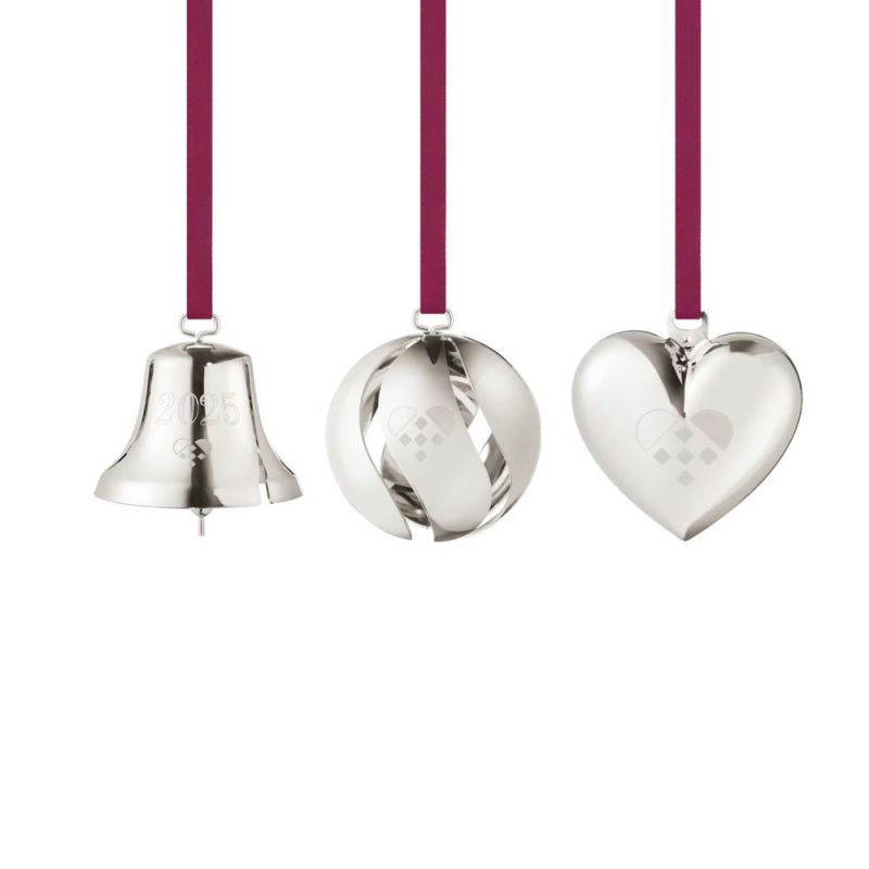 Dette sæt med tre palladiumbelagte ornamenter fra Georg Jensens 2025 Julekollektion indeholder en juleklokke, en julekugle og et julehjerte alle med elegante indgraveringer af det ikoniske flettede julehjerte. Med deres funklende overflader og fine detaljer bringer ornamenterne et strejf af klassisk julestemning og nostalgisk charme ind i hjemmet. Sættet leveres med to bånd: et i traditionel rød og et i årets kollektionsfarve, bordeaux, så du kan tilpasse udtrykket til din egen juledekoration.