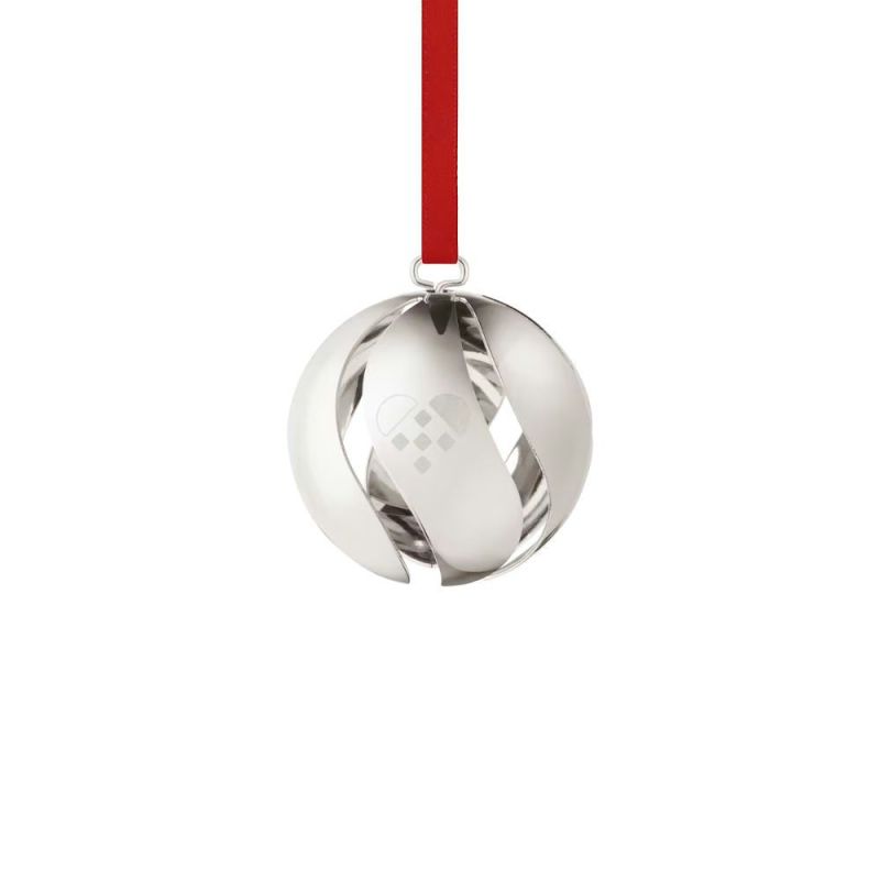 Denna julgranskulor från 2025 års julkollektion är pläterade med 18 karats palladium och tillverkade med eleganta sniderier som ger en modern tolkning av den klassiska julgranskulorna. Det graverade flätade julhjärtat ger ett tidlöst och atmosfäriskt uttryck. Julgranskulorna levereras med två band, ett i den traditionella röda färgen och ett i kollektionens speciella vinröda nyans.