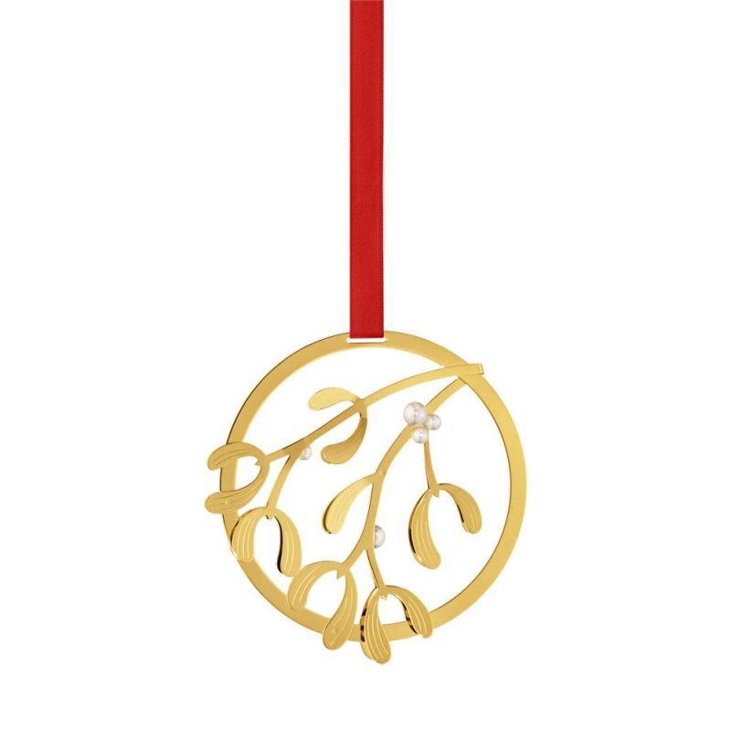Denna eleganta julprydnad blir en del av Georg Jensens fasta julkollektion. Den är tillverkad i mässing, belagd med 18 karats guld, och motivet är en mistelkvist i en rund ram. Ett rött band medföljer så julprydnaden kan hängas upp på trädet eller skapa en mysig julstämning på andra platser i hemmet.