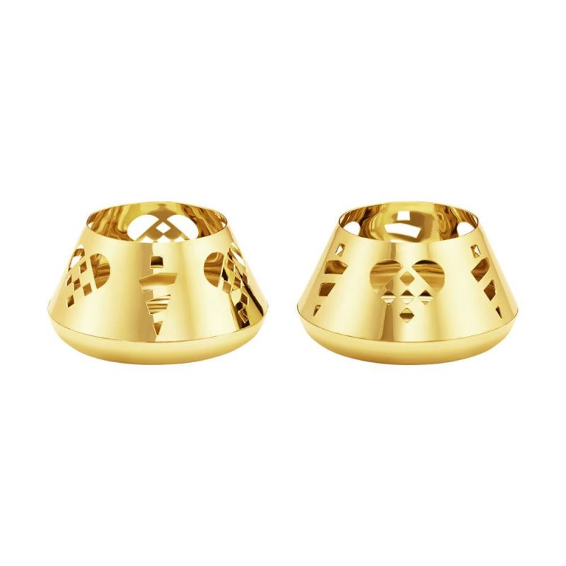 Denna uppsättning av två glittrande värmeljusstakar, pläterade med 18 karat guld, framhäver skenet från de levande ljusen på vackraste sätt. Designen är inspirerad av klassiska danska julmotiv, och värmeljusstakarna har fina utskärningar av flätade julhjärtan och strutar, som skapar en mysig atmosfär i ditt hem.
