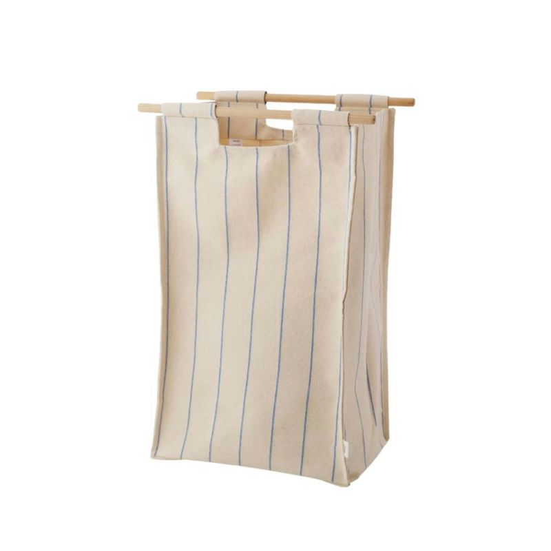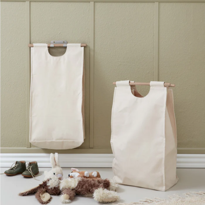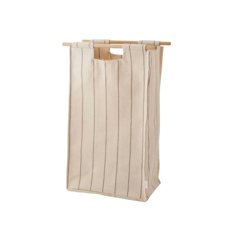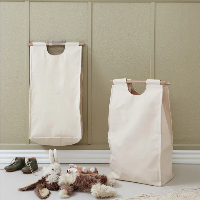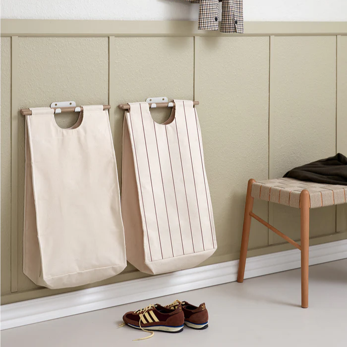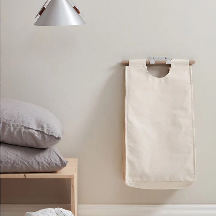 Elegant, väggmonterad förvaringslösning för tvätt. Med den väggmonterade förvaringslösningen blir det enkelt och elegant att förvara och sortera tvätt. Systemet består av en elegant metallkrok som hängs på väggen, samt ekpinnar som håller textilpåsen säkert på plats på kroken. Kombinationen av metall, ek och textil skapar en vacker kontrast mellan materialen och ger ett enkelt, stilrent utseende.